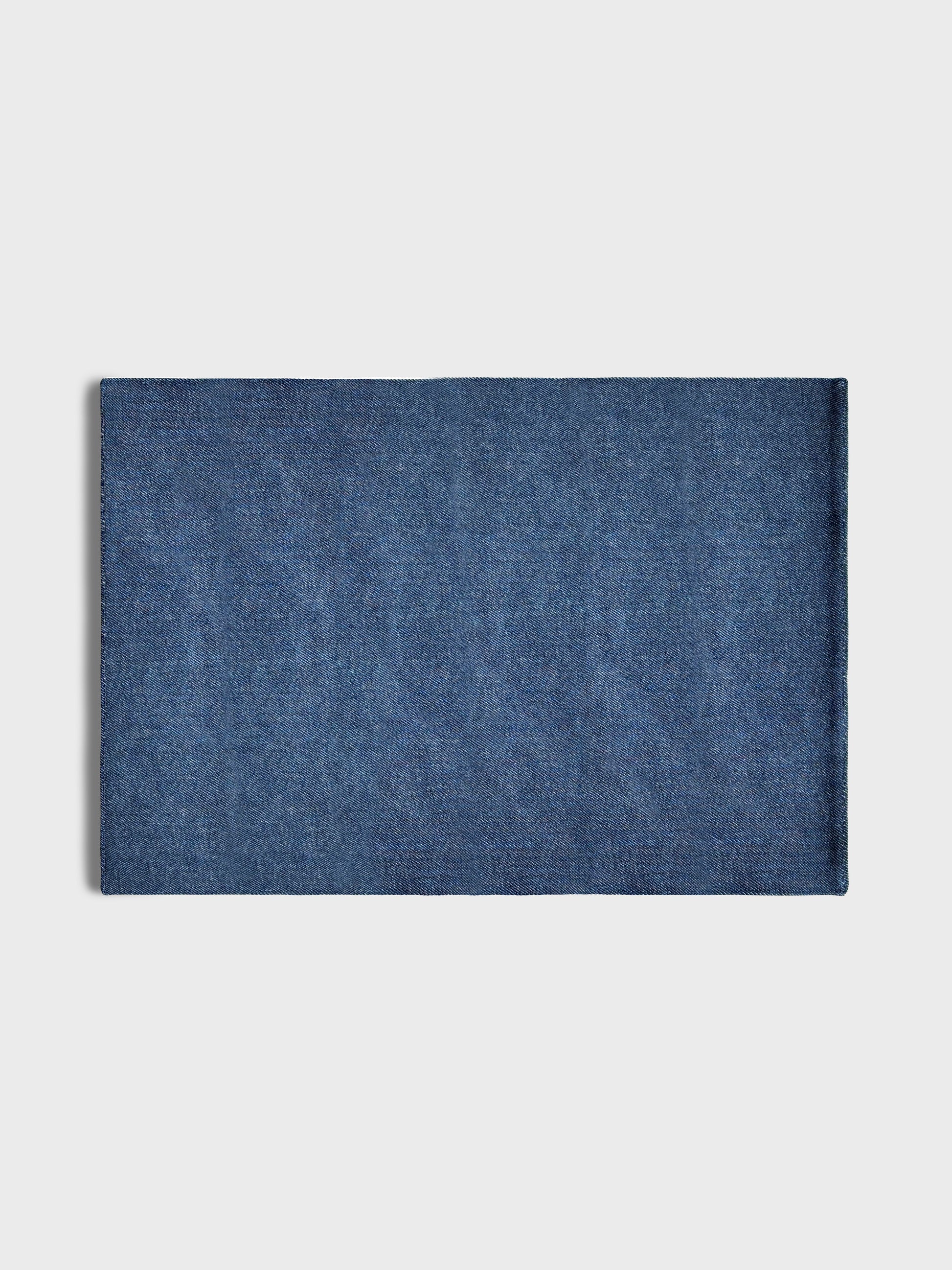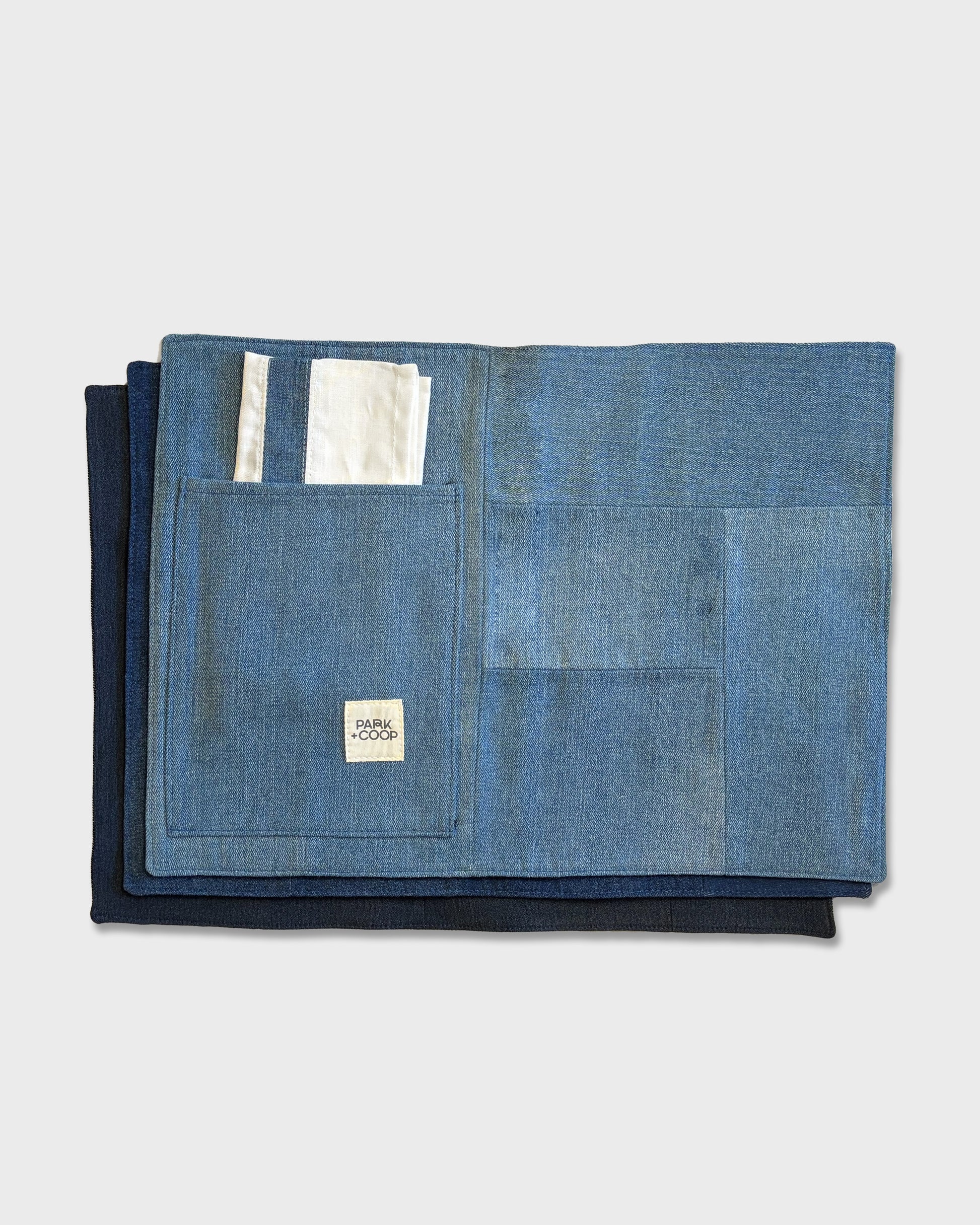 This two-sided placemat features a fun, quirky pocket with upcycled denim on one side and elegant, plain denim on the other. Create a unique table by sliding one of our dinner napkins and your silverware into the pocket or get creative by using it for a dessert menu, a flower, or a surprise for your guest. The color and wash on the pocket side will vary from pictures show. The plain dark blue side is made from deadstock denim so will match perfectly on all placemats in your shipment.